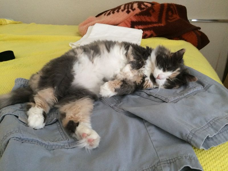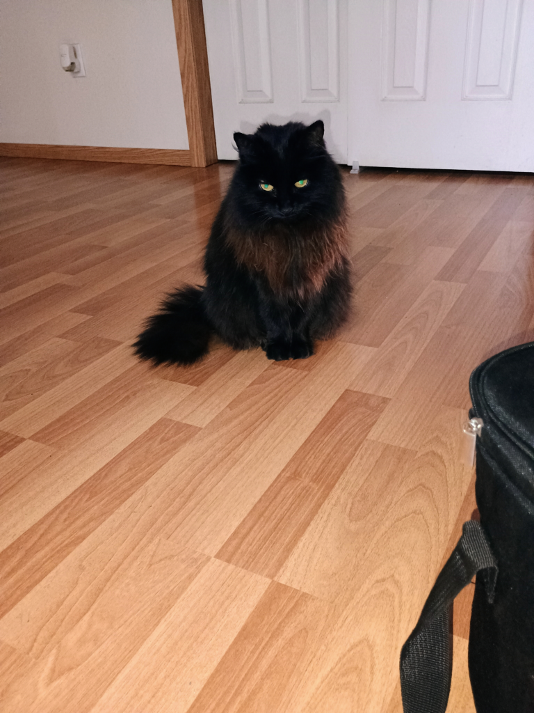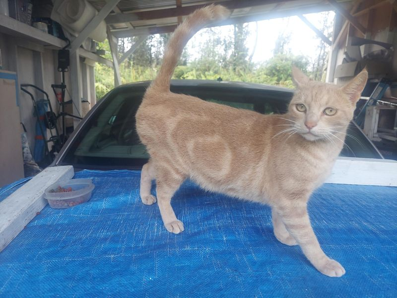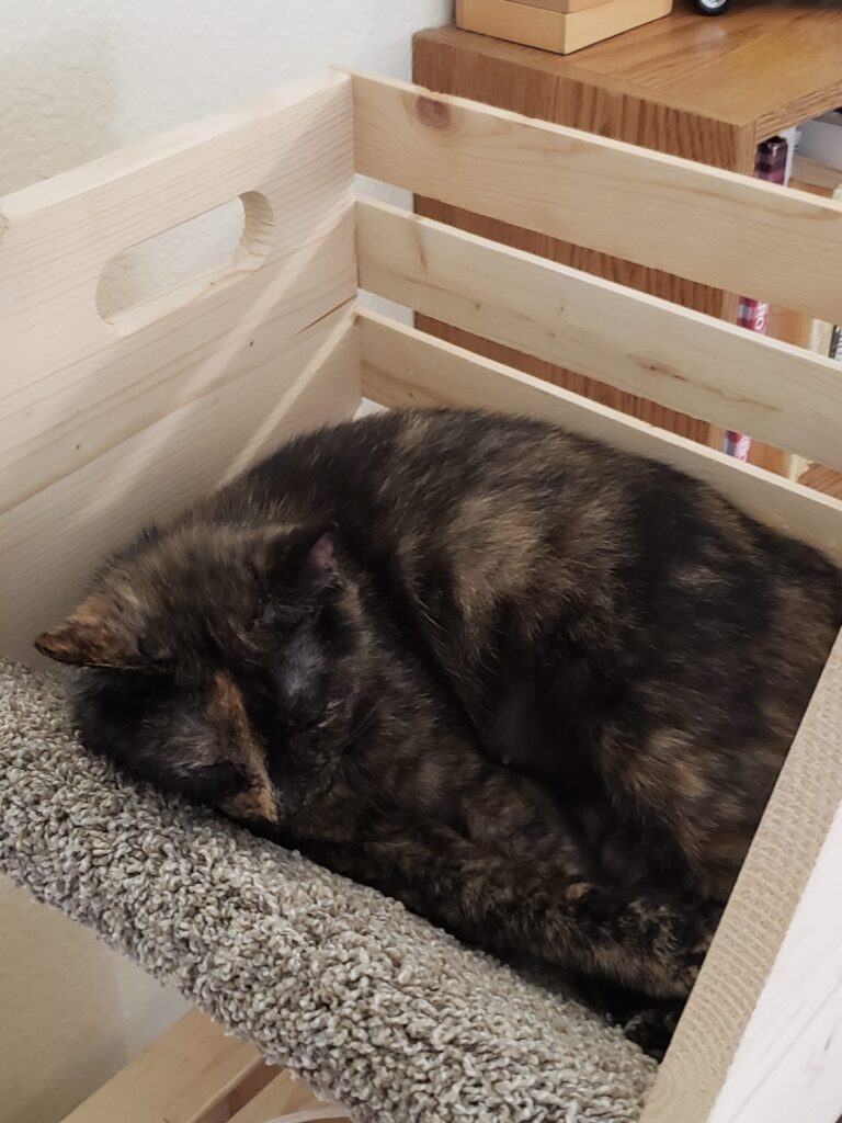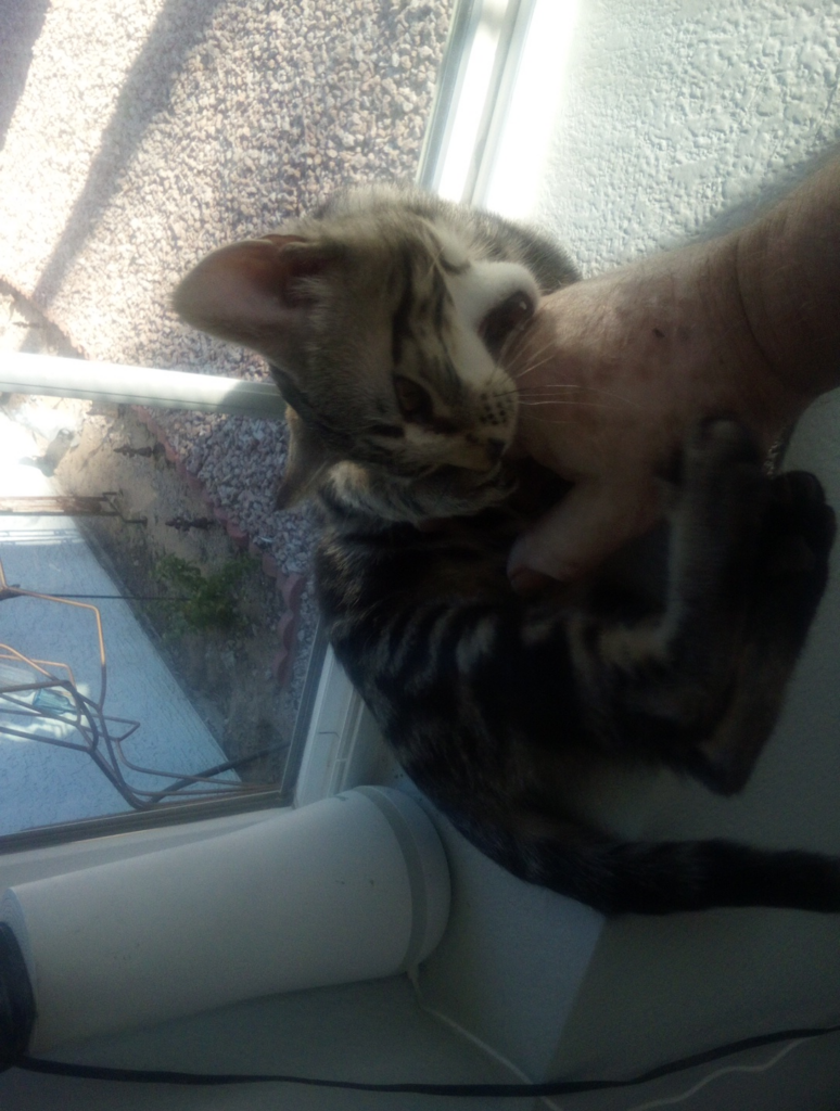 Wild, wild West, Kevin, I don’t know if you’d call this little bundle of need a tortoise shell or a calico but most often, we called her shithead with good reason. Anyway, we’ve generally named them for cartoon characters in alphabetical order, and this is the second one that owned us, Blondie, here being held up to swat at a moth flying around the back porch light by Mrs. WWW. Never a dull moment around Rancho de la El Salvaje Oestre (Ranch of the Wild West).