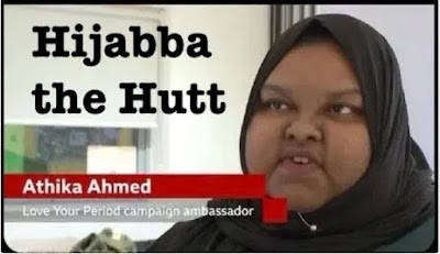 I’m opposed to the whole mandatory-headcovering idea in general, but for this … creature I’m in favor of the niqab (the version that covers the face, leaving only a slit fit the eyes). Obviously not to conceal her feminine charms from potential rapists [1], but as a courtesy to other human beings.