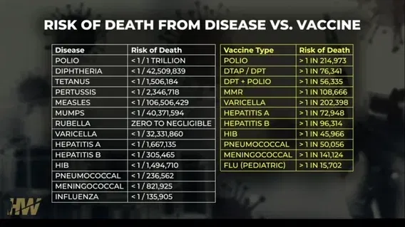 The numbers in the left column are because the vast majority of people are vaccinated against these diseases…that prior to vaccines killed thousands. Some minor diseases like measles may not need vaccination for….if you get the disease as a child when the negative outcomes are rare. However measles in adults has a lot of negative outcomes, But for most communicable diseases the risk of the vaccine is minor compared to the risk from the disease. This reality does NOT apply to the recent mRNA based vaccines which cause far more harm and virtually no benefit.