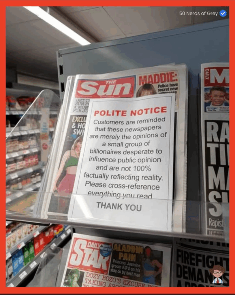 Especially from tabloid rags like The Sun, Daily Mail, NYT, WAPO, Chicongo Times, LA Times and most of print or online papers here and in the EU. They’re all owned by far left loons so you know there’s no truth there. Reading their drivel is like listening to an echo because they all spew the same horse chit word for word.