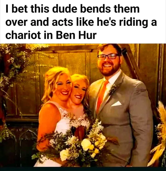 So many potential pitfalls in this situation, I can barely wrap my head around it. They (the conjoined sisters) share a single reproductive system (right? Not sure if that has ever been revealed). If the other sister wants to get married, now both husbands are having to “share” the same body when getting busy. Seems to me this would be fraught with the risk of drawing in weird ass dudes with very odd sexual proclivities as their only pool of potential mates, as virtually no normal man is going to be down for that. What if hubby is going to town, and the sister he didn’t marry get’s her “big O” first? I can foresee thermonuclear levels of butthurt.