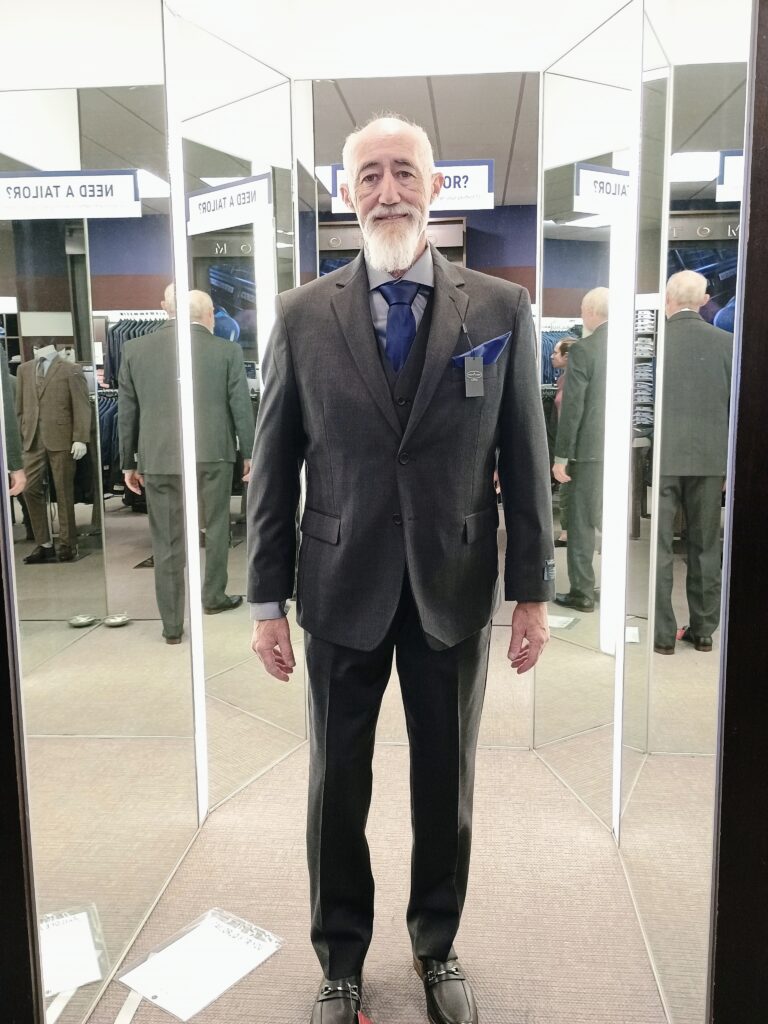 Now, I have no suits, just a black cotton Dickies trousers, a light gray Western shirt, a darker gray vest and a bolo tie that is my funeral/wedding and that is dressed up for me. My uniform now, shorts, T-shirts and tennis shoes or moccasins.